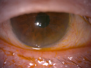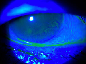 目に傷があっても、傷自体が透明なので、普通に見ただけでは傷は分かりません。このため、黄色い色素の目薬をして、ブルーライトを当てて傷が際立って見やすくした状態で状態を把握します。