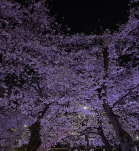 暗闇の中、ライトに照らされた桜が浮かび上がり、昼間とは異なる美しさでした。