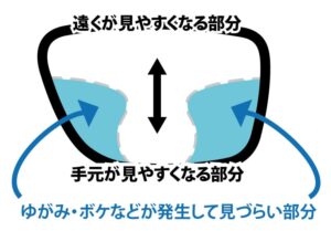 しかし、1枚のレンズに遠くと近くの度数をぎゅっと収めるため、どうしても遠く専用、近く専用の眼鏡よりも見える幅が狭く、見える質も落ちてしまいます。レンズの構造上、上部が遠く、下部が近く用というように、1枚のレンズに度数がグラデーション状に配置されている為、この境目や周辺部に歪みが出やすく、視線を動かした際に景色が揺れて感じたり、気分が悪くなったりすることがあります。